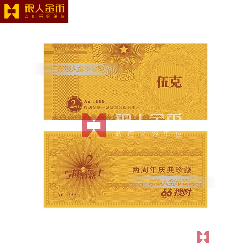 核心材質(zhì)專用防偽鈔紙(含安全線、熒光纖維等)999 足金 / 999 純銀,克重可選 1g/2g/5g(金)、10g/50g/100g(銀)