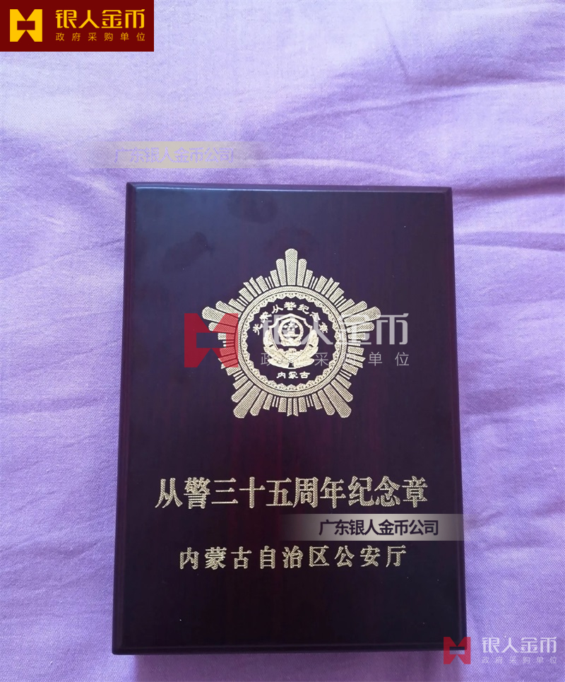 從警紀念章定制,從警年限紀念章定制,從警獎章定制——從警紀念章的底下主體部分都是警徽,上面橫檔部分是不相同的,有:從警十年紀念(從警10年紀念章)、從警二十年紀念(從警20年紀念章)、從警三十年紀念(從警30年紀念章)從警四十年紀念(從警40年紀念章)”不同的,從警十年紀念章(從警10年獎章)表面是鍍銅色銅質(zhì)獎章)、從警二十年紀念章(從警20年獎章)表面鍍(銀質(zhì)獎章)、從警三十年紀念章(從警30年獎章)和從警四十年紀念章(從警40年獎章)表面鍍金色金質(zhì)獎章) ,整體將從警獎章或從警紀念章(從警特定年限紀念章也叫從警章)鑲嵌在三折的立式木盒上面,木盒外面配有紙盒,整體做工精美,木盒紙盒上面都刻有警徽從警年限等。