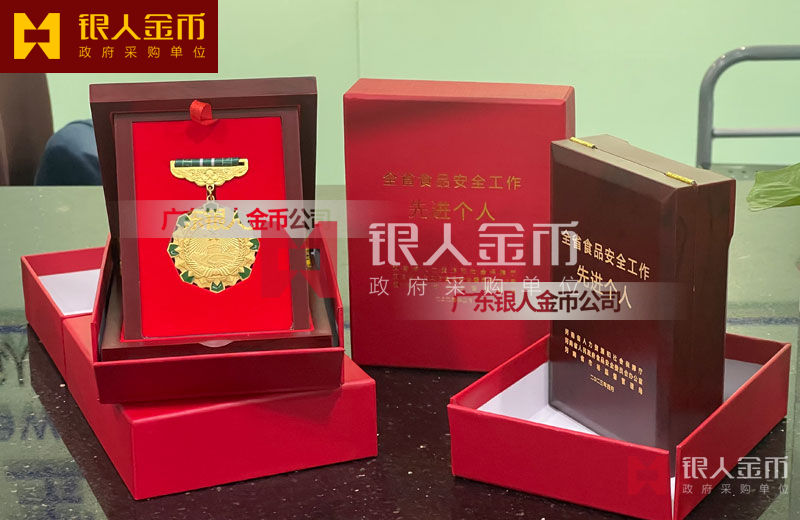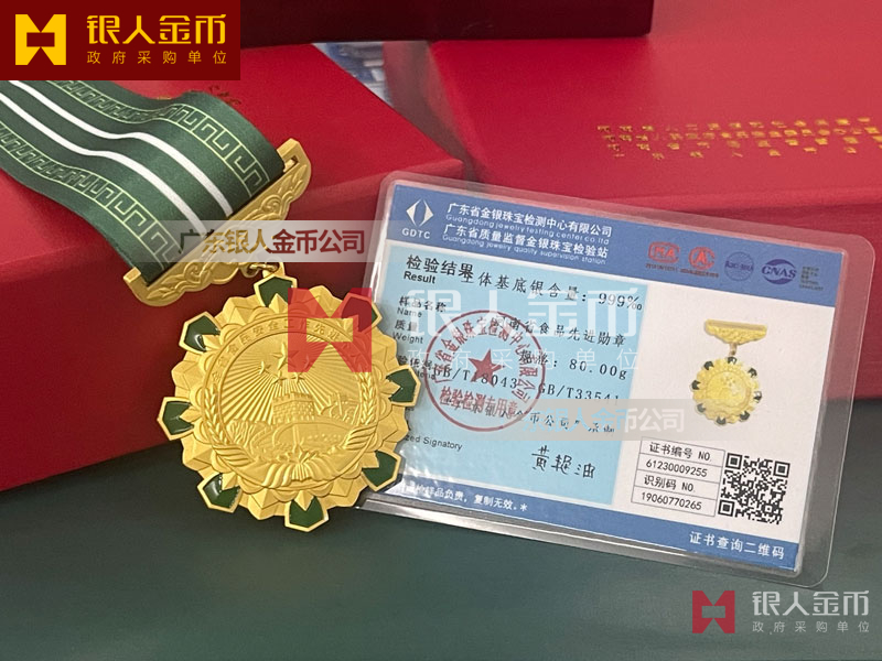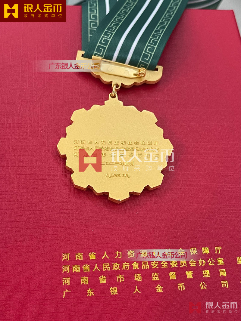 • 河南省食品安全先進勛章:采用 Ag.999 純銀鍍金工藝,重量 80.00g,經(jīng)廣東省金銀珠寶檢測中心檢測,基底銀含量 999‰,配套綠色綬帶與紅色禮盒,由河南省人社廳、市場監(jiān)管局等部門聯(lián)合頒發(fā)。