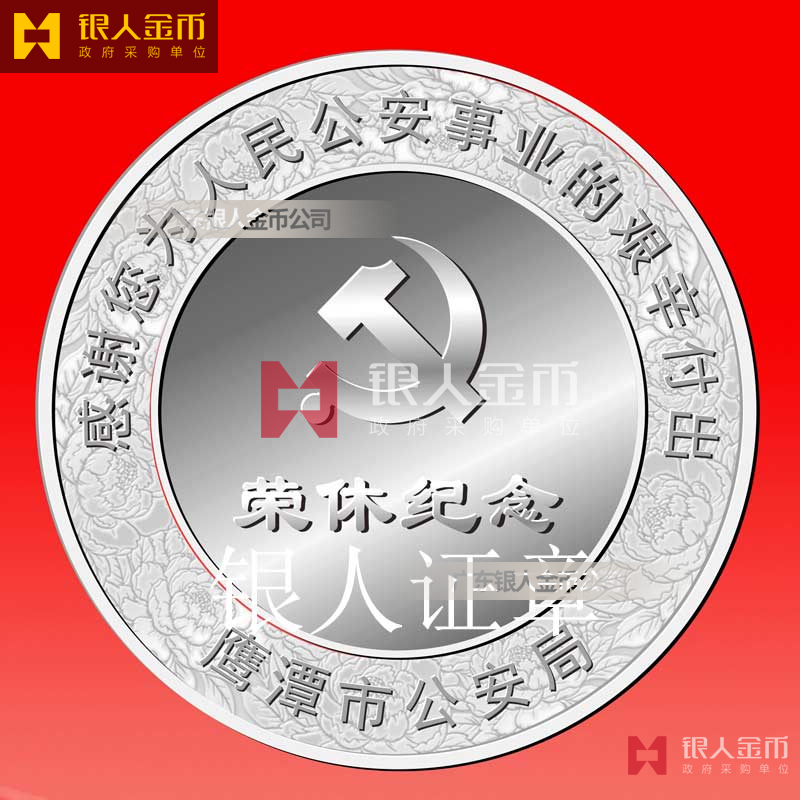 • 榮休紀念銀章:為鷹潭市公安局定制,采用 Ag.999 純銀材質(zhì),正面鐫刻黨徽與 “榮休紀念” 字樣,邊緣飾以牡丹花紋,背面標注 “感謝您為人民公安事業(yè)的艱辛付出”,兼具紀念意義與收藏價值。
