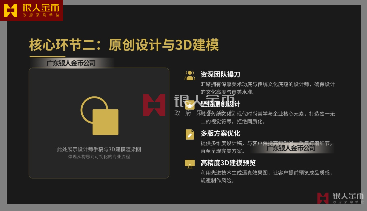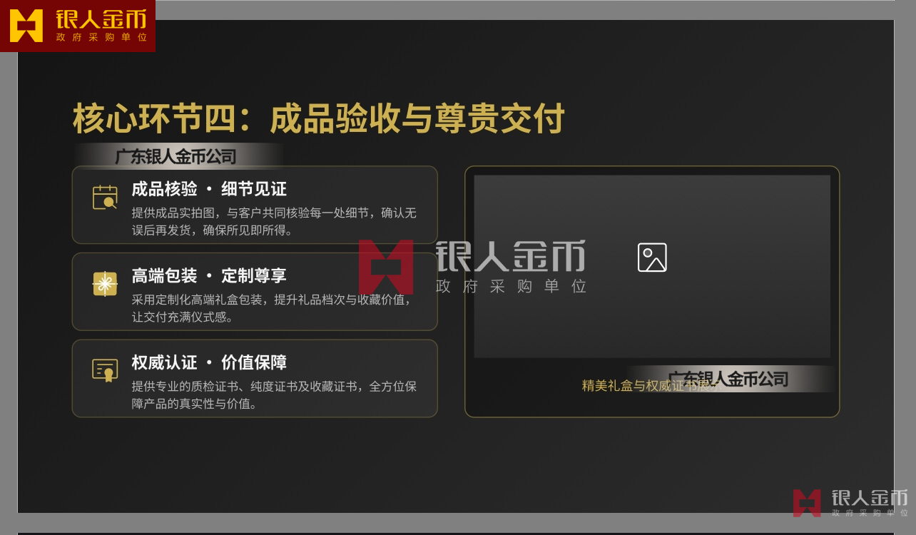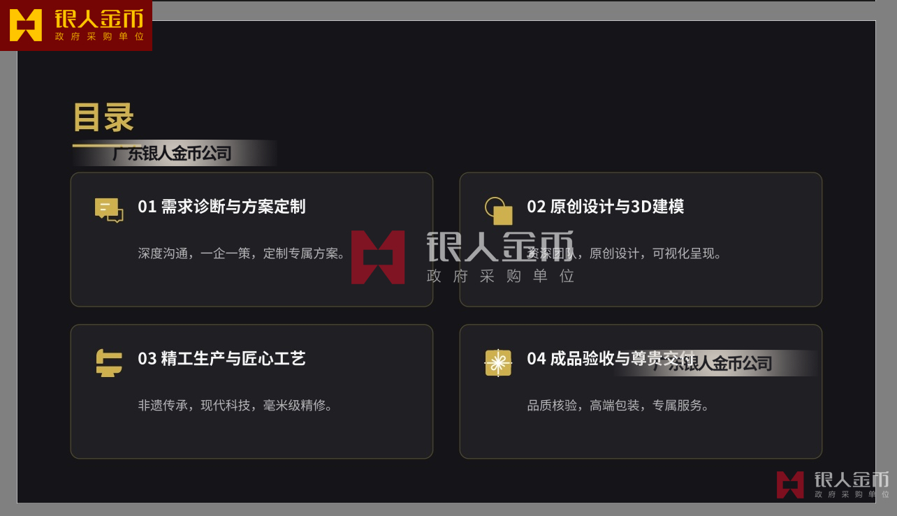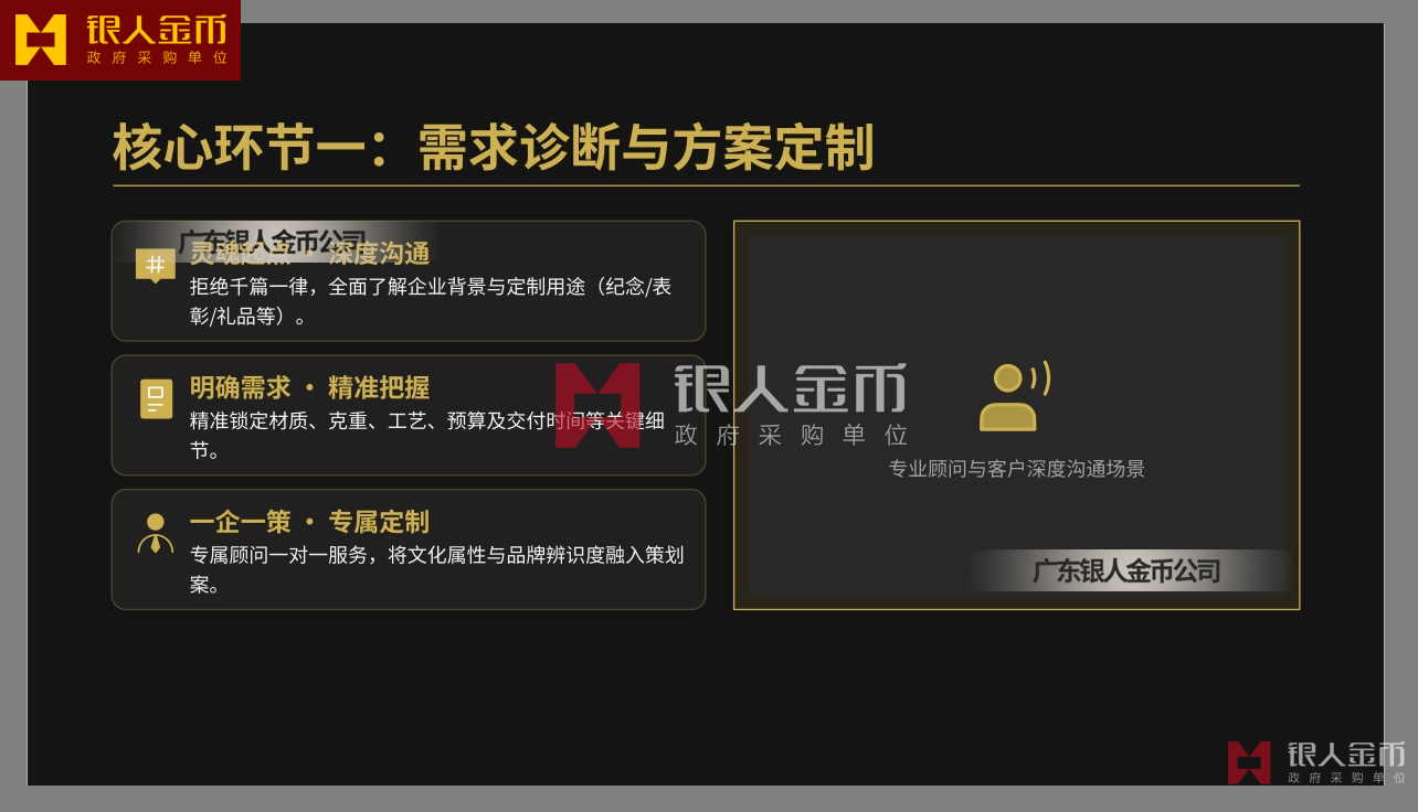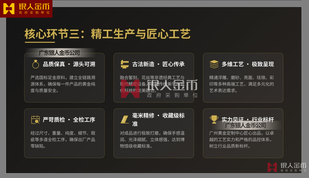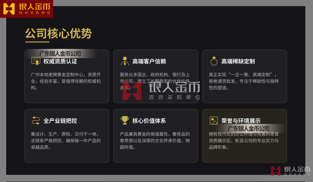 廣東銀人金幣公司針對高端客群對獨特性的追求,提供深度的個性化定制服務.基于客戶需求,結合黃金制品與企業(yè)文化元素,定做獨一無二的專屬珍品,極大提升了企業(yè)的價值感和尊崇感!